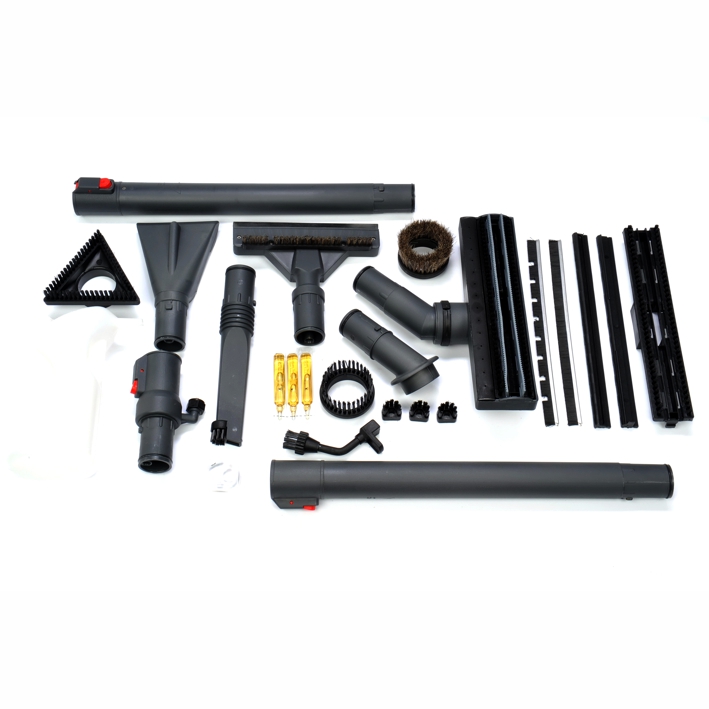 Lieferung inklusive: Dampf-/Saugschlauch, Füllflasche, Fugendüse mit Halbrundbürste, Ersatz-Halbrundbürsten (3 Stück), gebogene Punktstrahldüse + Rundbürste, Verlängerungsrohr 2×0,5m, Bodendüse, Hartbodenaufsatz für Bodendüse, Teppichbodeneinsatz für Bodendüse, Fensterdüse, Polsterdüse, Schalldämpfer, Sifondüse mit Rundbürstenaufsatz
