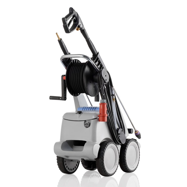 Integriertes Fahrwerk, Anschlußkabel 7,5 m, 20m Stahlgewebe-Hochdruckschlauch, Schlauchtrommel, Sicherheits-Abschaltpistole, Total-Stop-Einrichtung mit verzögerter Motorabschaltung, Sicherheitsabschaltung, Schmutzkiller-Lanze, Sprühlanze mit Edelstahlrohr, stufenlose Druckregulierung, Messingpumpenkopf, Trockenlaufsicherheit, keramikbeschichtete Pumpenplunger, Halterung für Abschaltpistole, Lanze und Schmutzkiller, Reinigungsmittelansaugung mit Filter