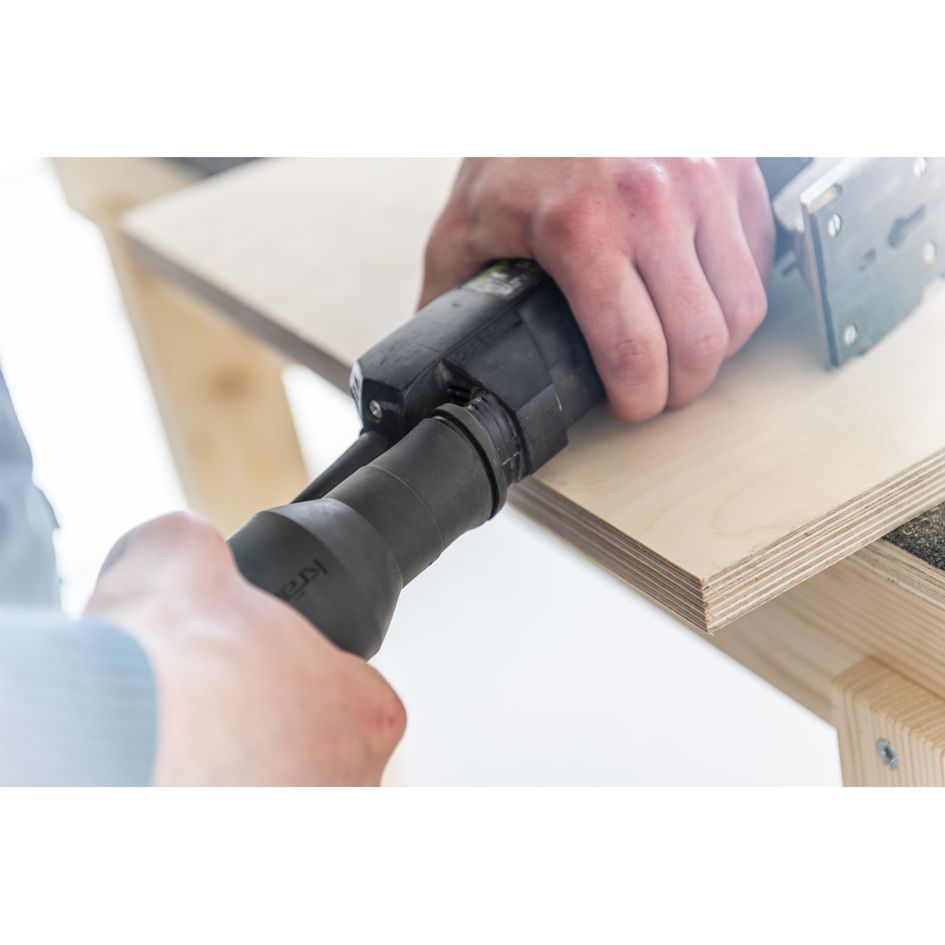 Integrierte Steckdose mit automatischer An- und Nachlauffunktion für bequeme Kombination mit absaugbaren Elektrowerkzeugen wie Bohr-, Schleif-, Fräs- und Sägemaschinen.