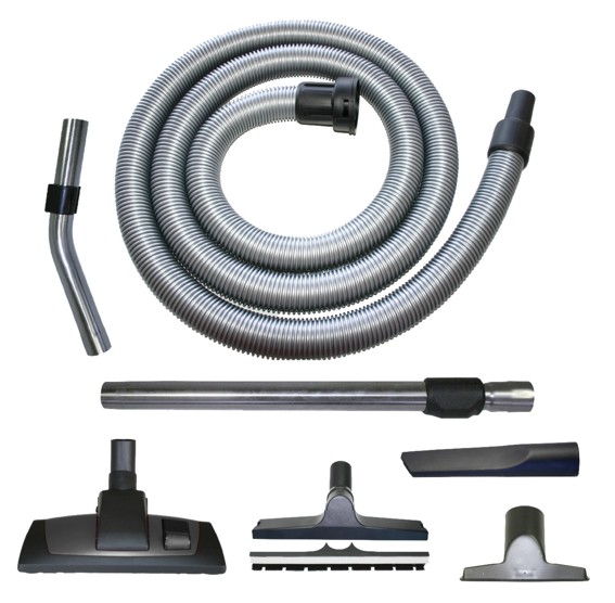 Hochwertiges Haushalts-Zubehörset bestehend aus 1 x Saugschlauch Ø 35 mm x 3,2 m, 1 x Edelstahl-Griffrohr mit Nebenluftschieber, 1 x Edelstahl-Teleskoprohr 60-95 cm stufenlos, 1 x Universaldüse, 1 x Düsenkörper mit Wassereinsatz 26 cm breit, 1 x Fugendüse 21 cm lang, 1 x Polsterdüse 12 cm breit inkl. 1 x Einsteckbürste