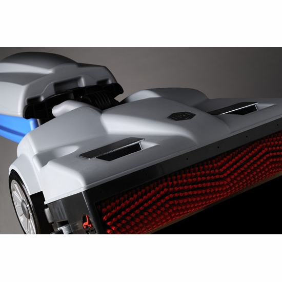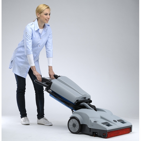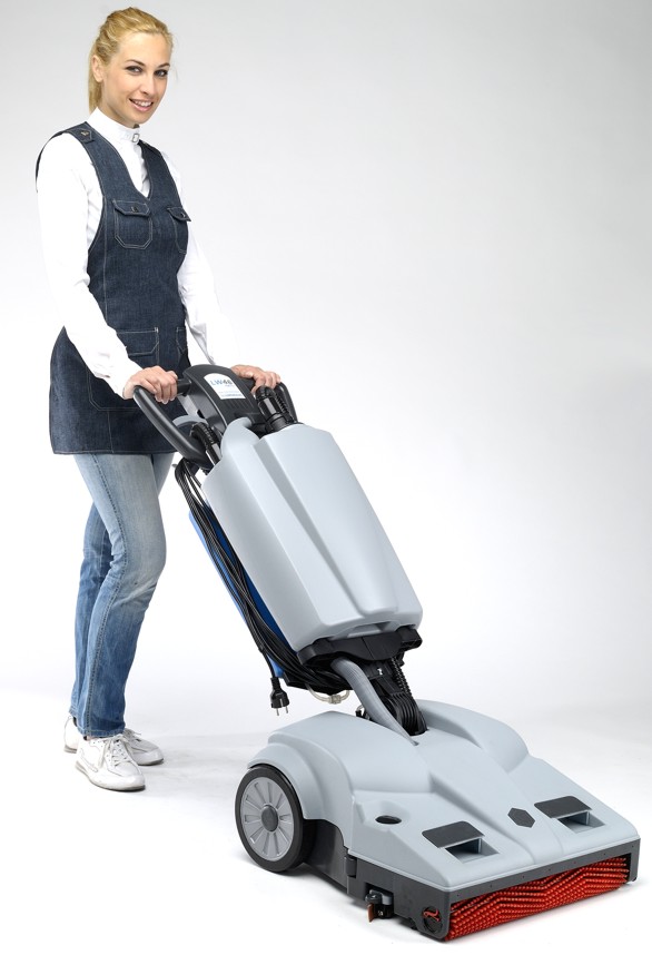 Das wichtigste dabei, die LW46 passt durch die Türen der Umkleiden und wird mit Akku angetrieben. In Ecken kann man die Handstange senkrecht nach oben stellen, so dass der Maschinenkörper nicht beim Umlenken in der Ecke stört.